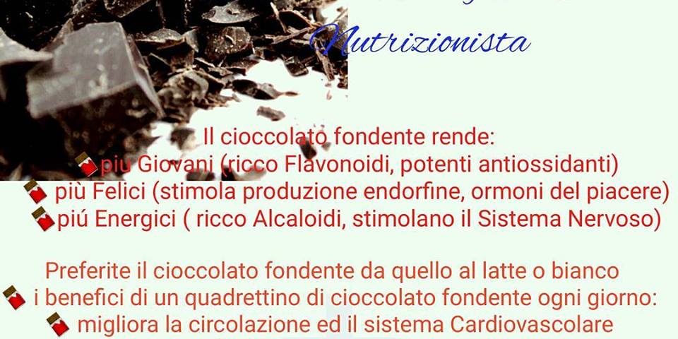 Per gustare a pieno dei benefici del cioccolato fondente bisognerebbe dirigersi verso una percentuale di cacao maggiore uguale al 60 %! Il cioccolato, infatti, contiene tante altre sostanze che non sono altrettanto benefiche, soprattutto grassi e zuccheri.