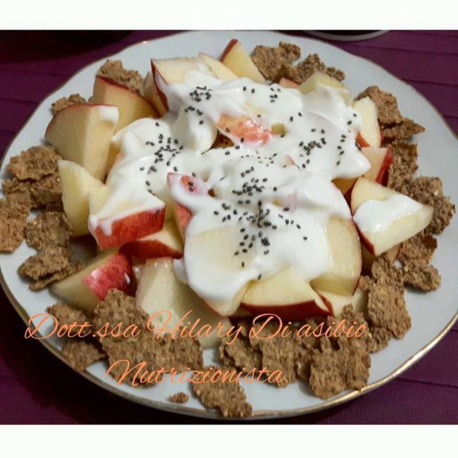Occorrono: 1 mela fuji yogurt greco 0,1 % fiocchi di kamut integrali semi di chia procedimento: Lavare accuratamente la mela e tagliarla a cubetti, disporla in un piatto o ciotola da portata con sopra yogurt greco, semi di chia e circondare il tutto con cereali di kamut integrali… Buona salute a tutti 🙂