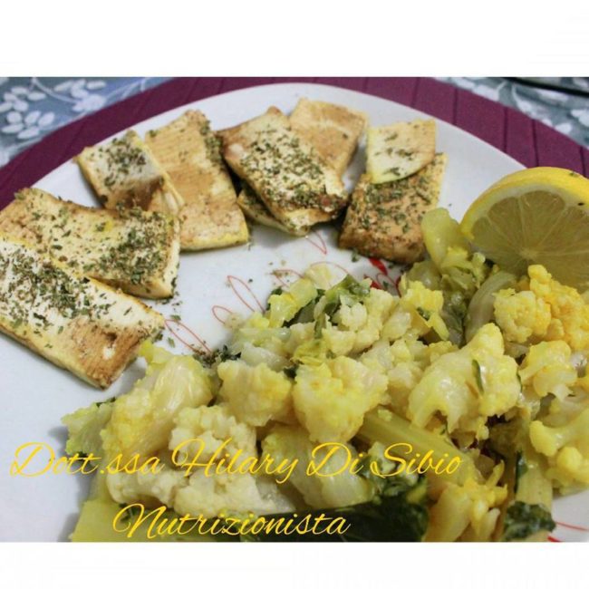 Ingredienti: Tofu Prezzemolo cavolfiori curcuma origano pepe nero olio evo Procedimento: Lavare e tagliare il panetto di tofu a strisce, riscaldare la griglia e poi grigliare qualche minuto per lato il tofu; nel mentre, sbollentare lievemente i cavolfiori con pizzico di curcuma. Terminata la cottura, impiattare il tofu grigliato con un spolverare di origano de…
