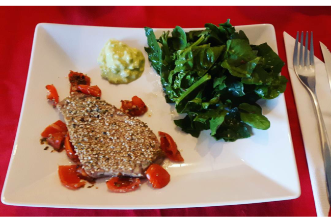 Ingredienti: *tranci di tonno rosso *semi di sesamo *spinaci freschi *semi di lino *pomodorini freschi *origano *limone Per la salsa: *avocado *aceto di mele *yogurt magro *curcuma Procedimento: Prendere i tranci di tonno e passarli nei semi di sesamo, adagiarli su una teglia da forno previamente rivestita da carta forno con pomodorini freschi a pezzetti…