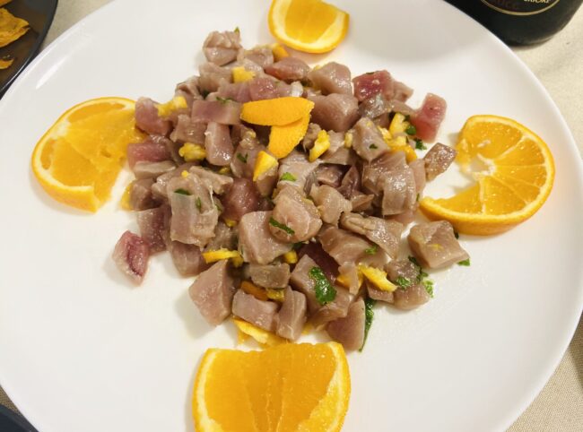 Ingredienti: trancio di tonno rosso 1 arancia bio olio sale pepe nero Procedimento: Per prima cosa acquistare il trancio di tonno abbattuto (per evitare qualsiasi rischio alimentare). Tagliare la tartare con un coltello affilato, io preferisco fare dei cubetti grandi, ma potete tagliarli di dimensione più piccole, se lo preferite! Spremere il succo…