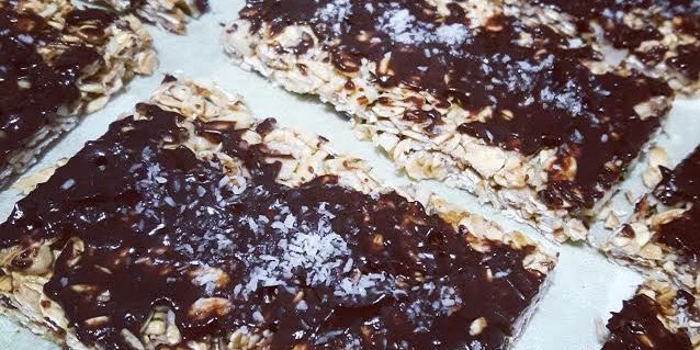 Barrette d’avena con mandorle, semi di lino e chia ricoperte da cioccolato fondente e farina di cocco