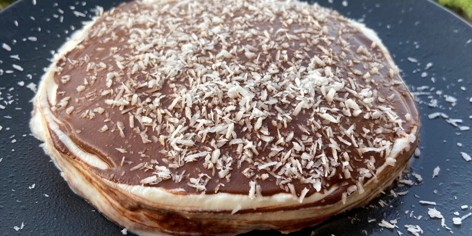 - Al mattino crea la cremina al cacao fatta con 2 cucchiaini di cacao amaro, 1-2 gocce di dolcificante e versa sulla cheesecake; infine cospargi con 1 ccchiaino di cocco rapè.