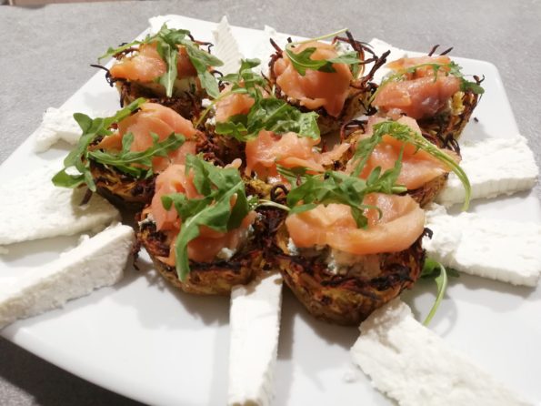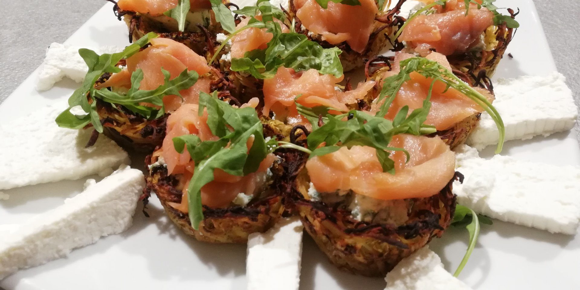 Lavare le zucchine e le patate, pelare solo le patate, e tagliarle entrambe a julienne; aggiungere un pò di sale, pepe nero ed un filo d’olio (2 cucchiaini), infine amalgama il tutto. Ora versa il contenuto nei stampini da muffin lasciando un vuoto centrale, in modo da formare dei cestini (rivestili di carta forno per evitare di oliare anche gli stampini o utilizza direttamente quelli in silicone). Inforna a 180-170 gradi per circa 35-40 min. Una volta cotti e croccanti, lasciali raffreddare e nel mentre prepara il ripieno di ricotta, verrà amalgamata con della rucola ridotta in finissimi pezzi. Fatto questo, riempi i cestini con la ricotta alla rucola e finisci il piatto adagiando delle fette di salmone affumicato, una foglia di rucola.