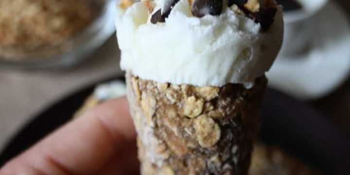 Iniziare riducendo a purea una banana, aggiungere la farina di avena, i fiocchi di kamut e di avena, l’olio di cocco e la cannella. Amalgamare il tutto e foderare con l’impasto ottenuto gli stampi a cono, precedentemente oleati (se l’impasto risulta troppo molle aggiungere altra farina). Infornare per circa 10 min. Una volta cotti, lasciarli raffreddare prima di rimuovere lo stampo.