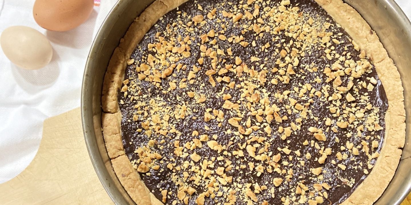 4 Ma il consiglio è di cuocere prima la frolla senza aggiungere la crema, per circa 15 min con un peso sopra (anche legumi secchi) e poi di farcire con la crema proteica al cioccolato , versare la granella di noci ed infornare per il restante del tempo.#adv adversting