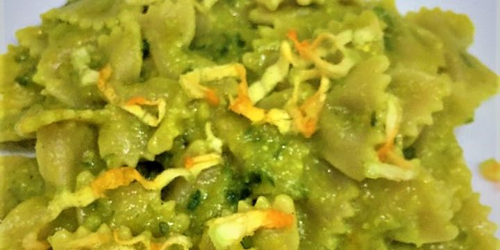 Farfalle integrali con crema di zucchine e fiori di zucca