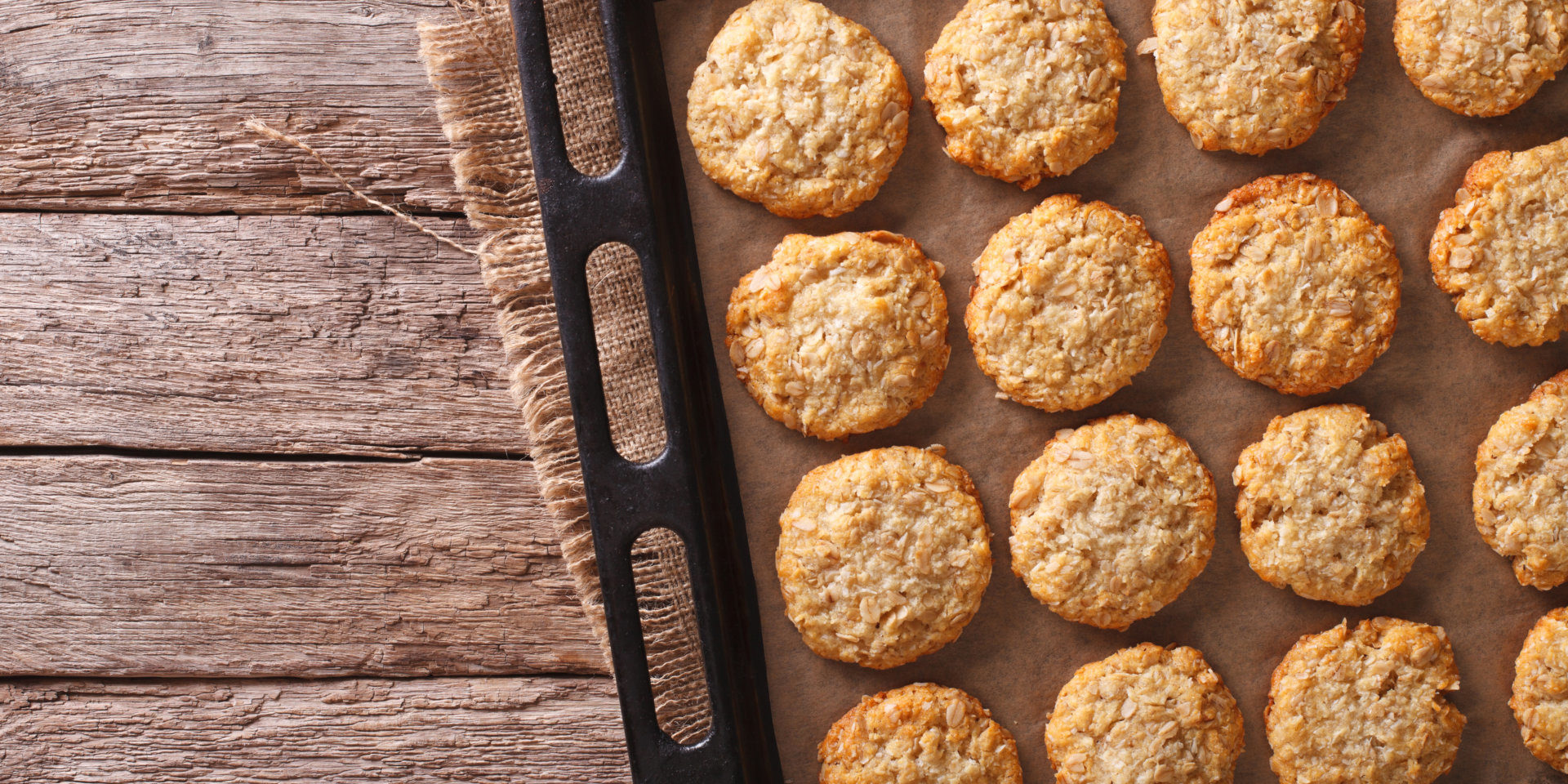 Australian oatmeal cookies close-up on a baking sheet on the table. horizontal view from above