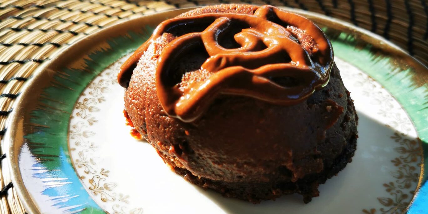 Nel mentre crea la Cremina al cacao. Fatta con 1 cucchiaio di cacao amaro, 2 cucchiai di acqua + 2 gocce di dolcificante amalgama il tutto e versa sul tuo mug cake.