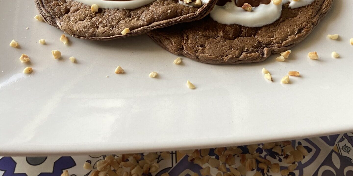 Per la farcia ho semplicemente dolcificato lo yogurt con yummy drops gusto vaniglia e Cosparso i miei pancakes. Poi ho versato la mia cremina a cacao (fatta con 1 cucchiaio di cacao, qualche goccia di acqua ed il dolcificante, giro energicamente fino a consistenza cremosa. Se è necessario aggiungo poco alla volta acqua). Ed infine la granella di nocciole … che devo dirvi .. una goduria