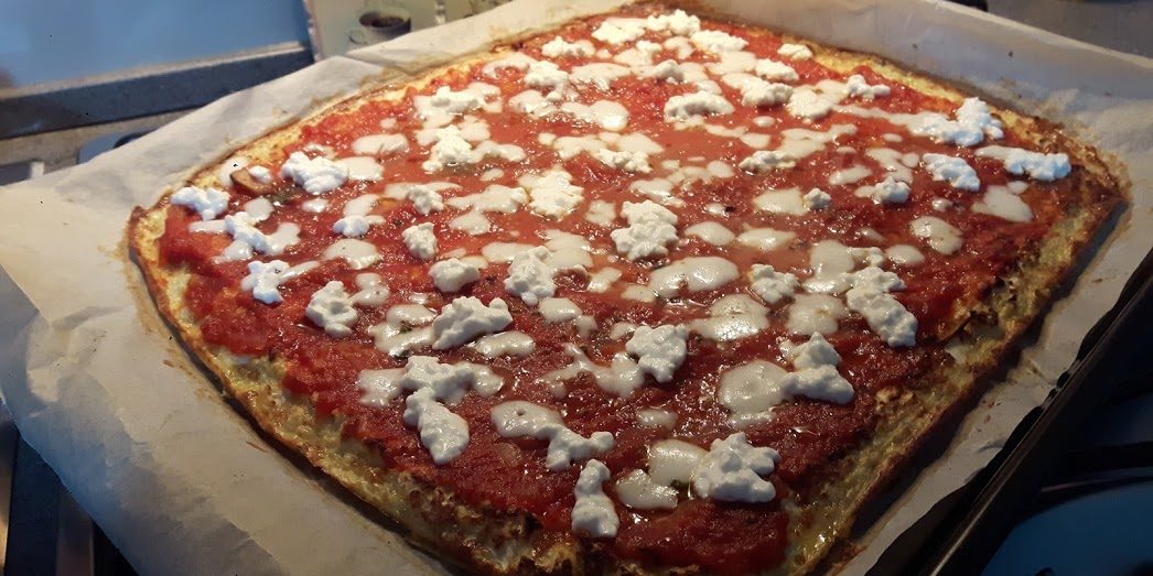 Per la base bisogna in primis frullare il cavolfiore fino a ridurlo a granuli fini; dopodichè versarlo in un recipiente ed amalgare insieme la farina di luppino, le spezie, le uova e gli albumi. Versare in una teglia da forno previamente rivestita da carta da forno, distendere in modo uniforme, con uno spessore di lmeno 5, 6 cm e cuocere a 180° C per circa 25 min, appena inizia a dorarsi, togliere dal forno e guarnire con la salsa di pomodoro condia di sale e spezie ed un pizzico di sale (a piacere), lasciare cuocere per circa 15 min. Rimuviamo dal forno, inserire sù il formaggio, io generalmente utilizzo la feta o i fiocchi di latte, informare per qualche minuti e voilà!