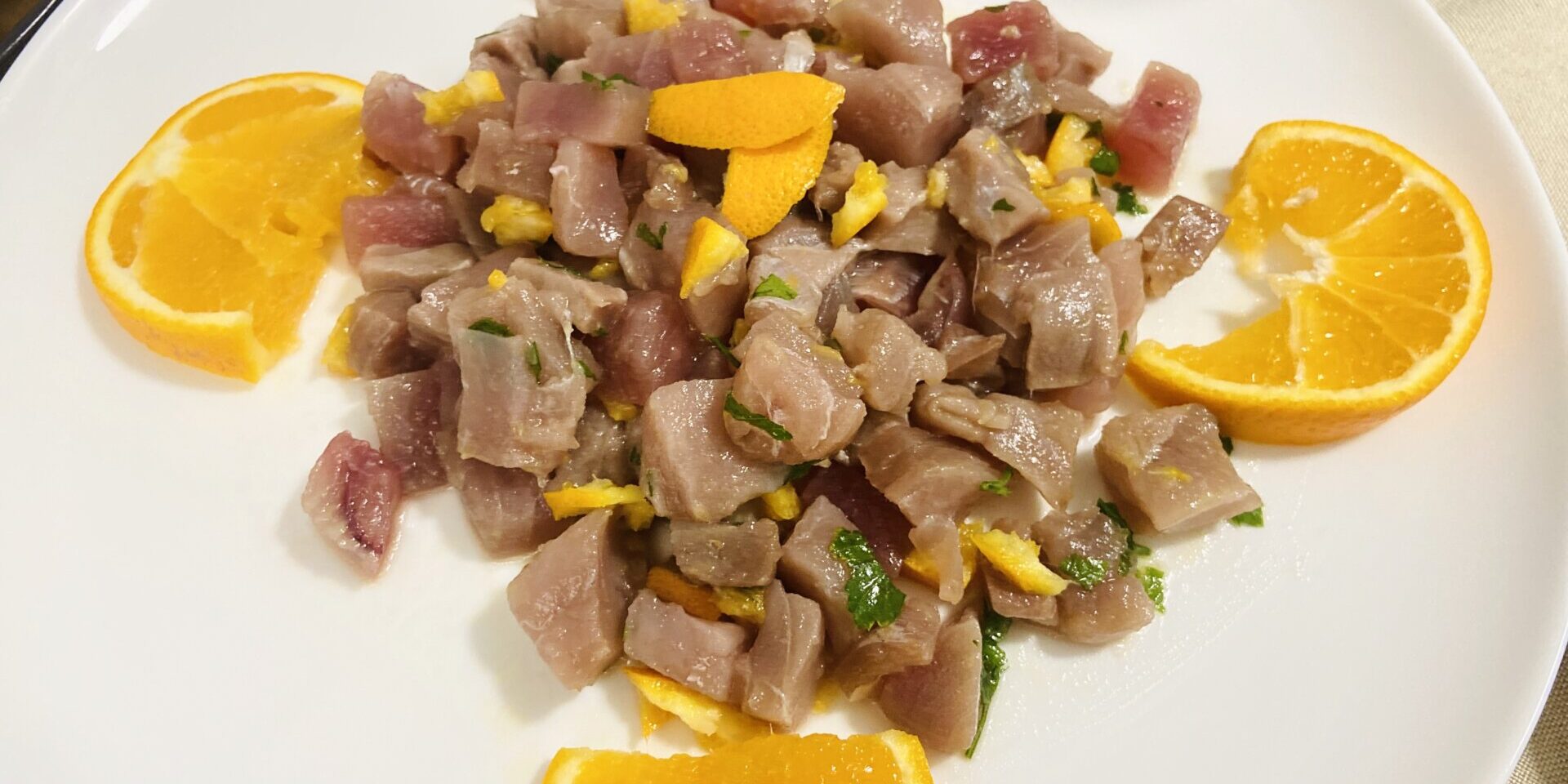 Spremere il succo di metà arancia, e tagliare delle scorzette sottilissime, versare nella tartare e condire con un pizzico di sale, olio ed un pizzico di pepe nero. Amalgamare bene il tutto …ed è subito pronta da gustare 🙂