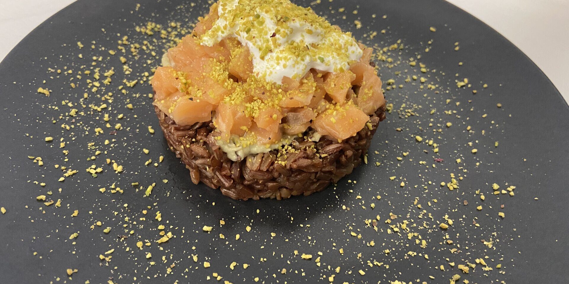 ??‍? Un letto di riso rosso coperto da salsa guacamole, tartare di salmone fresca, un cappello di stracciatella ed infine una pioggia di granella di pistacchi ?