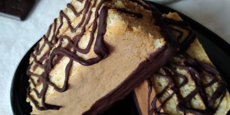 Poi li ho fatti raffreddare e tagliati in rettangoli (ogni tegolino é formato da 3 rettangoli). Ho farcito gli strati con una crema fatta con cacao amaro in polvere, acqua e qualche goccia di dolcificante. Infine ho sciolto del cioccolato fondente ed ho immerso la base di ogni tegolino e con l’aiuto di una sac a poche ho riprodotto i decori tipici di questa merendina.