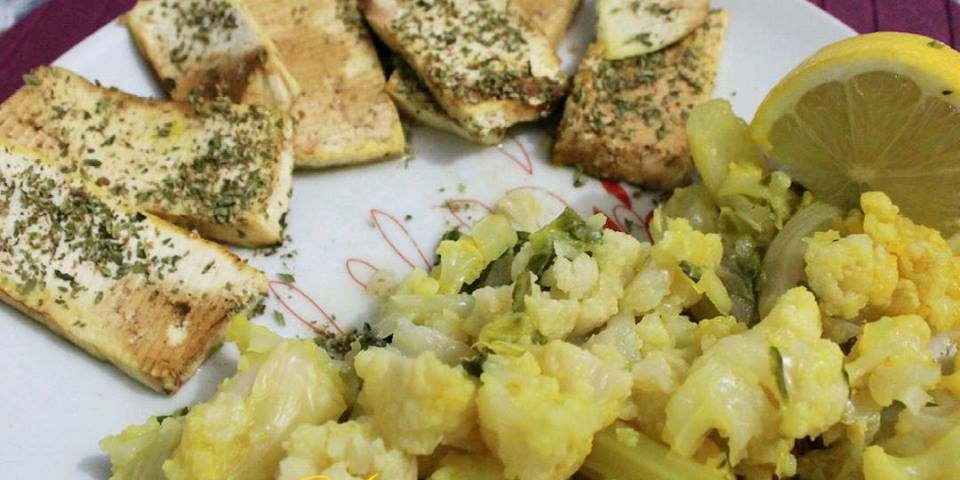Lavare e tagliare il panetto di tofu a strisce, riscaldare la griglia e poi grigliare qualche minuto per lato il tofu; nel mentre, sbollentare lievemente i cavolfiori con pizzico di curcuma. Terminata la cottura, impiattare il tofu grigliato con un spolverare di origano de il cavolfiore alla curcuma, il tutto condito con un filo di olio evo a crudo e pepe nero.
