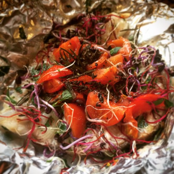 Prendere la verdesca e porla in un foglio di carta stagnola ,aggiungere succo di limone ,rosmarino ,prezzemolo e pomodorini . Chiudere la stagnola e infornare a 200 gradi per una ventina di minuti . In un altro foglio di stagnola porre la salvia e infornarla ,lasciando però la stagnola aperta ,in modo tale che divento croccante ,per una decina di minuti . Finita la cottura aprire il cartoccio e ultimare il piatto con i baccelli di soia a crudo ,i semi di chia e la salvia croccante sbriciolata sopra . Condire con olio extravergine d’oliva e sale rosa.