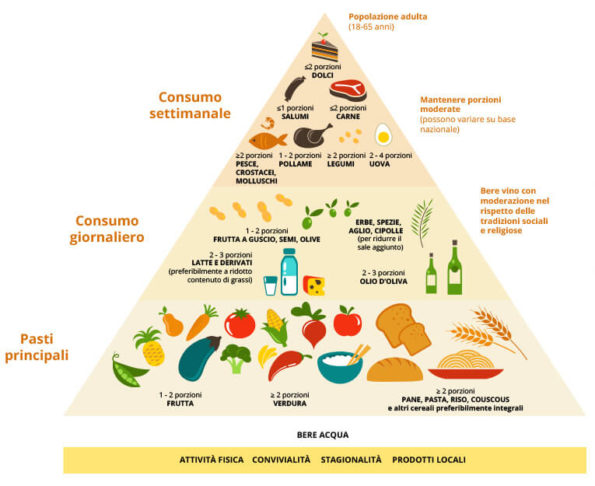 La dieta Mediterranea viene espressa attraverso una rappresentazione grafica: la piramide alimentare elaborata dal Ministero della Salute per trasmettere in modo diretto e semplice i principi su cui si erige tale stile alimentare.